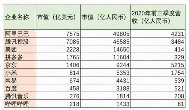 从市值排名来看,阿里市值位居第一,高达7575亿美元(约人民币4.98万亿元),而腾讯则位居第二,市值同样高达7085亿美元(约人民币4.66万亿元),随后就是美团、拼多多、京东、小米、网易、百度、腾讯音乐、哔哩哔哩,大家最为熟悉的BAT组合,互联网从此没有大家最为熟悉的BAT组合。
