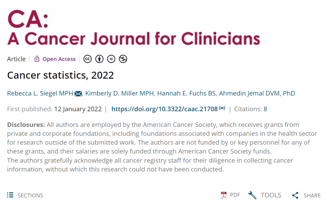 今年1月12日,最新的研究报告(发病率数据截至2018年,死亡率数据截至2019年)已经出炉,并发表在神刊 CA(影响因子:508.702)这本杂志上。