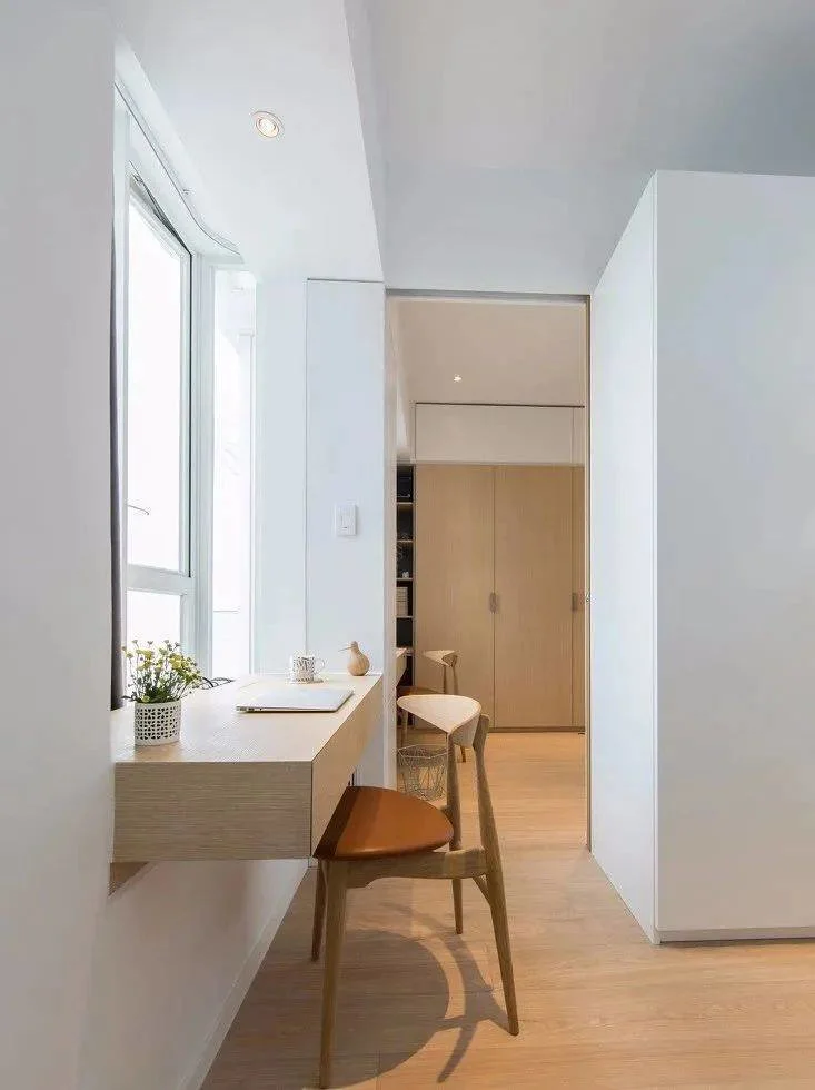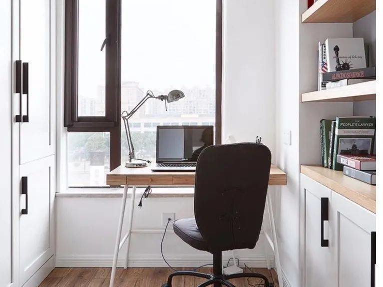对于小户型家庭来说,由于空间有限,书房成了奢侈品。这种情况下,将飘窗改造成读书角或者书房也是一个不错的选择。飘窗良好的采光条件,不管是工作还是学习都很适合,既浪漫又惬意,偶尔还能极目远眺,缓解眼睛疲劳。