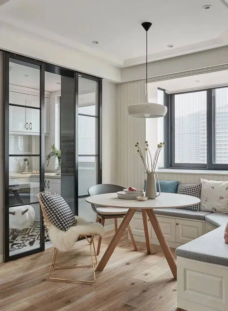飘窗变身卡座,配合桌椅形成舒适的休闲区域,既美观也可增加一定的餐厅收纳。功能既完整,也不会影响空间动线的顺畅。