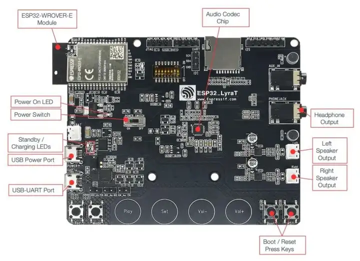 ESP32-LYRATD-SYNA模块也有4Mb闪存,以及用于音频应用的所有电路。该板包括一个音频编解码器、一个音频放大器以及耳机和扬声器插孔,以全面测试音频应用。