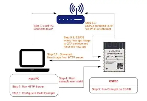 图5显示了部署和更新过程的步骤。开发者需要先执行红色的步骤,将OTA解决方案部署到ESP32模块上,接下来橙色步骤的作用是推进OTA更新。