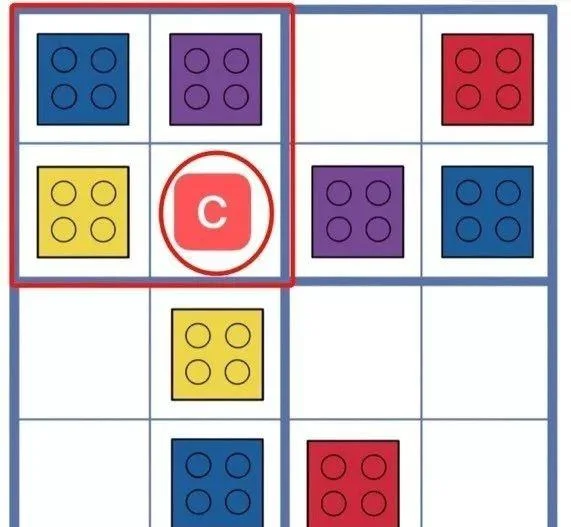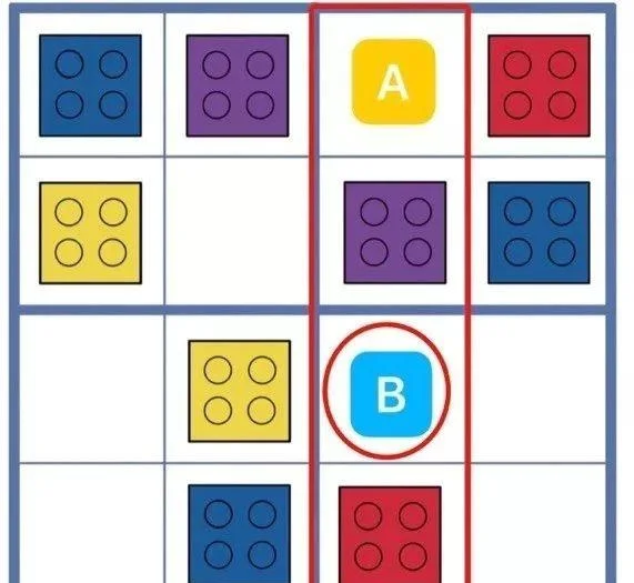 而当这个空格被确定后,再次观察这个卡片,就能看到,这个黄色乐高所在的这一列,也有了三个确定的乐高,所以,果果又推断出空格B处应该放蓝色乐高。