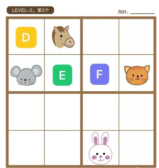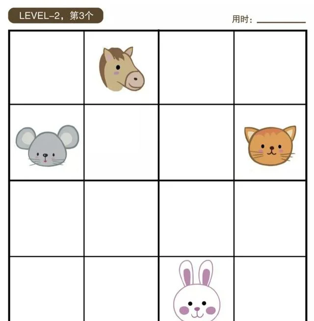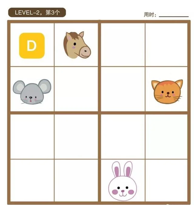 根据数独占位的规则,第一列不能再出现老鼠,第二列不能再出现马,第三列不能再出现兔子,第四列不能再出现猫。而第二行不能再出现兔子和猫。