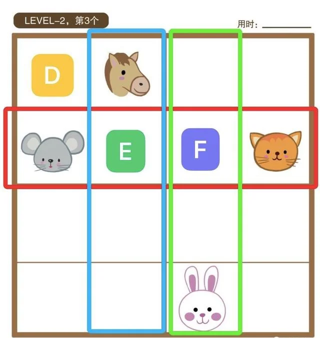 果果先放兔子试了试,那么宫内的E空格就只能放猫,可是放猫就和这一行后面的猫冲突了,所以说明,E空格需要放兔子,而D空格需要放猫。