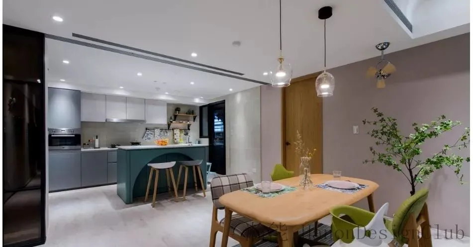 厨房与客厅、餐厅间则以玻璃拉门作间隔,可阻挡做饭时恼人的油烟味到处飘散。 整体空间用简约的白、灰色系来打底,搭配淡雅的木纹、藕色壁面以及多色家具家饰,调和出了一种温馨的室内气息。