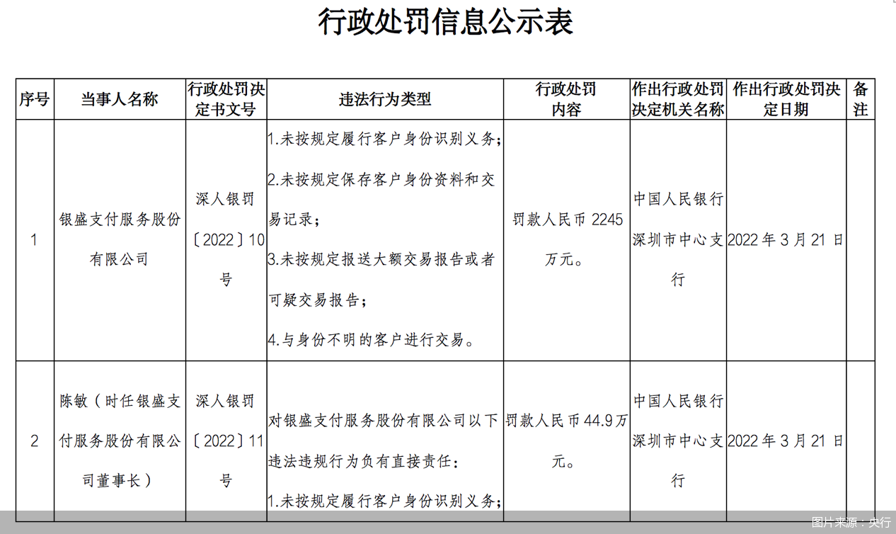 根据央行深圳市中心支行日前披露的行政处罚信息公示表,因存在未按规定履行客户身份识别义务、未按规定保存客户身份资料和交易记录、未按规定报送大额交易报告或者可疑交易报告、与身份不明的客户进行交易等4项违规行为,银盛支付被罚款2245万元,也是截至目前年内第三方支付领域的最大罚单。