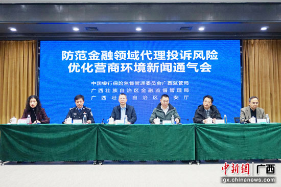 图为新闻发布会现场。1月20日,中国银行保险监督管理委员会广西监管局、广西壮族自治区地方金融监督管理局、广西壮族自治区公安厅联合召开《关于防范金融领域代理投诉风险优化营商环境的通告》新闻通气会,呼吁金融消费者有效识别非法代理投诉的诈骗手段和危害,增强自我保护意识和树立依法维权意识。