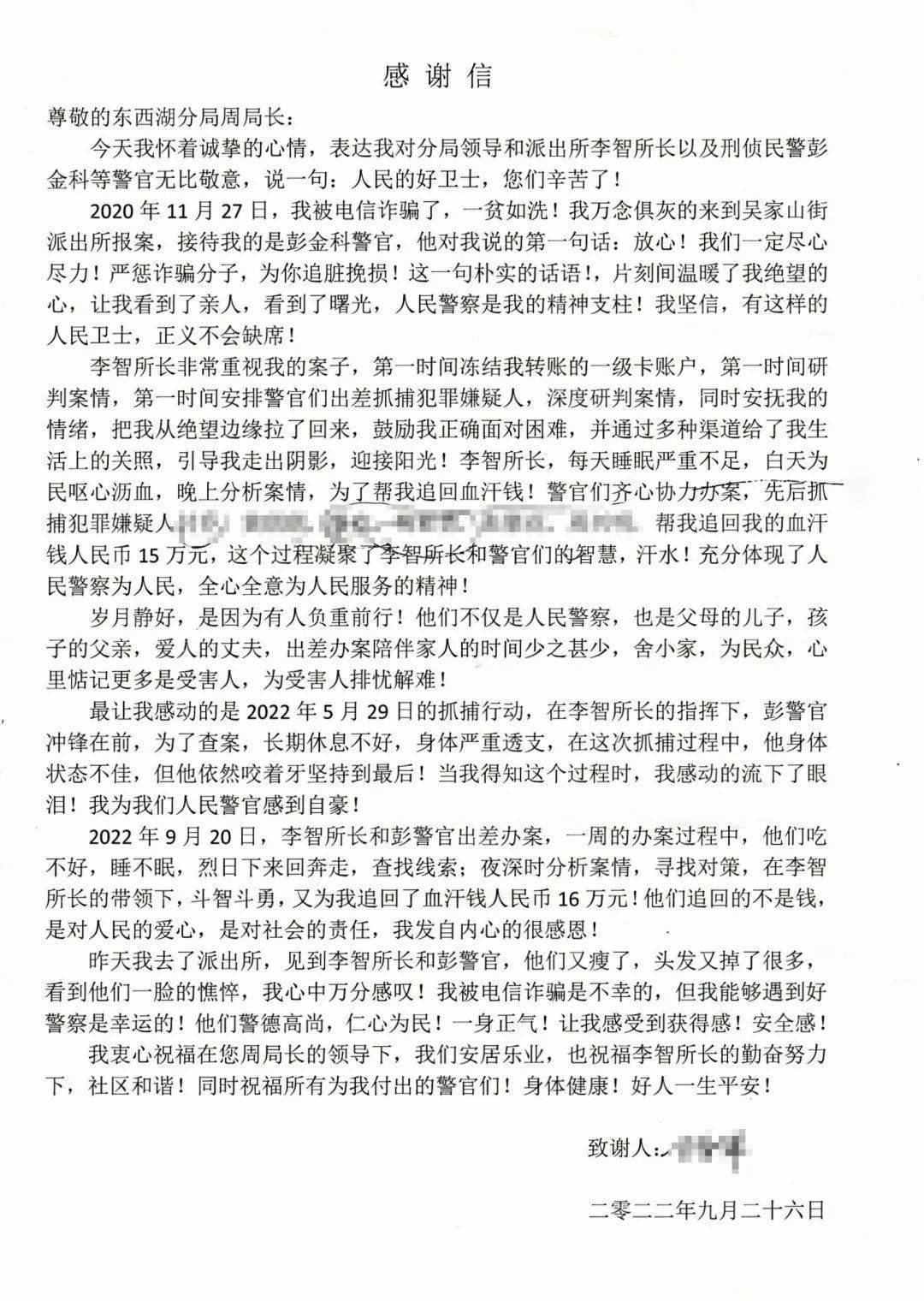 10月9日,电诈案件受害人曾花(化名)特意来到武汉市公安局东西湖区分局吴家山街派出所,送上一封情真意切的感谢信,以及自己一针一线精心刺绣的锦旗,对派出所民警坚持不懈为她追赃挽损表达诚挚谢意。