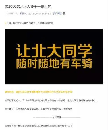 2015 年 6 月 16 日,一篇题为《这 2000 名北大人要干一票大的》的帖子在北大传开。帖子中表示,要招募 2000 名勇士把自己的自行车贡献出来,这 2000 人之后就可以免费使用这 2000 辆车,而其他同学则可以付费使用这些车。