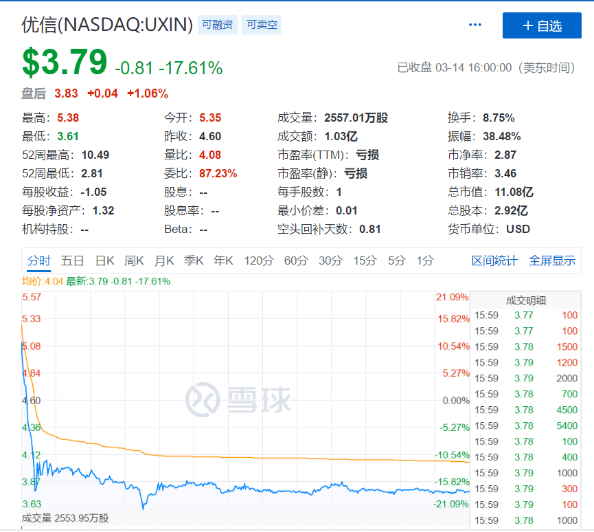受财报中净亏损收窄、营收增长等利好消息,优信盘初一度涨逾16%,但暴涨后迅速转跌,当日报收3.79美元/股,跌去17.61%,总市值跌至11.08亿美元。