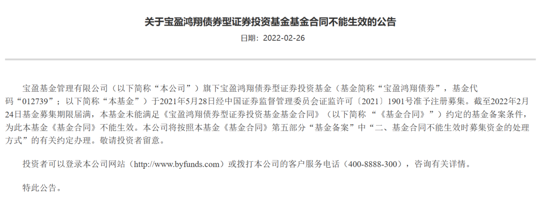2月26日,宝盈基金发布公告称,旗下宝盈鸿翔债券型证券投资基金(下称宝盈鸿翔)于2021年5月28日准予注册募集,截至2022年2月24日基金募集期限届满,宝盈鸿翔未能满足基金合同约定的基金备案条件,宝盈鸿翔的基金合同不能生效。