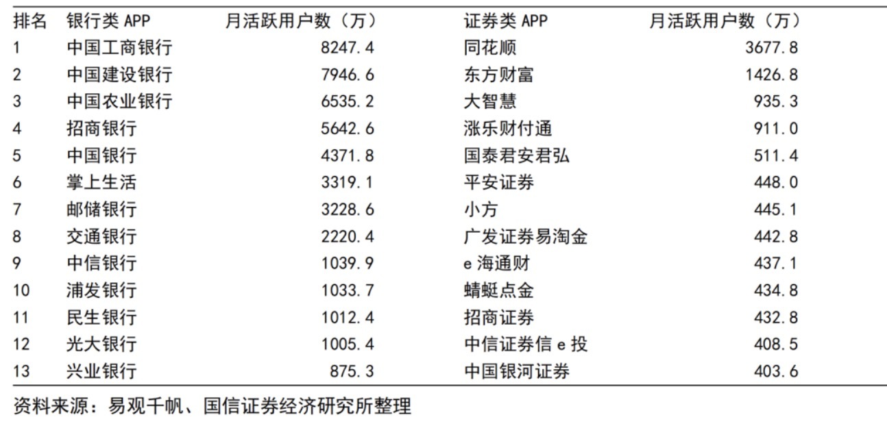 表4:证券公司APP月活跃用户数远远低于银行(2020年6月)