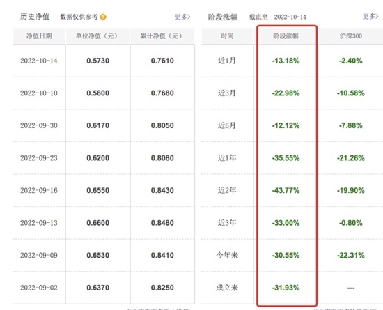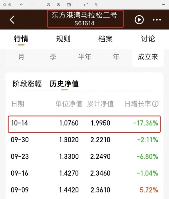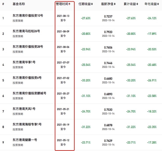 此外,东方港湾旗下其他基金经理管理的产品最新净值同样出现较大回撤。以任仁雄管理的东方港湾春风三号为例,截至10月14日,净值为0.573,自成立以来回撤超过31.99%,近1个月回撤为13.18%。