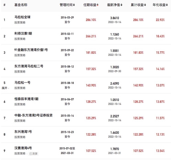 根据私募排排网数据显示,在但斌管理的219只私募中,截至目前已有9只收益翻倍基金,其中马拉松全球与利得汉景1期成立以来的年化收益均超20%。不过对比鲜明的是,其在2021年成立的50余只产品截至10月14日的累计收益为负。