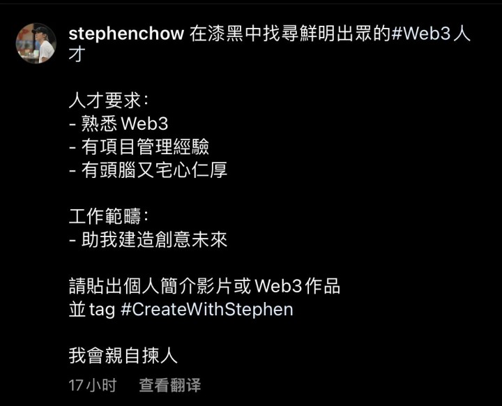 昨天半夜发布的这则招聘信息,这样写道:在漆黑中寻找鲜明出众的Web3人才。人才要求:熟悉Web3,有项目管理经验,有头脑又宅心仁厚。工作范围:助我建造创意未来。应聘者需要提交个人简介影片或者Web3作品,周星驰表示会亲自选人。