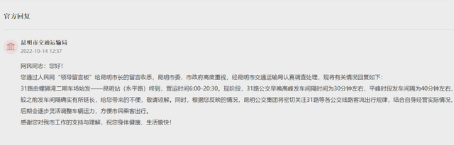 网友建议昆明公交车高峰时段不减少班次官方回复