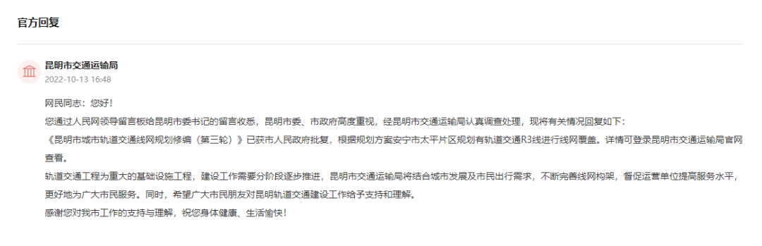 昆明市交通运输局回复网友截图