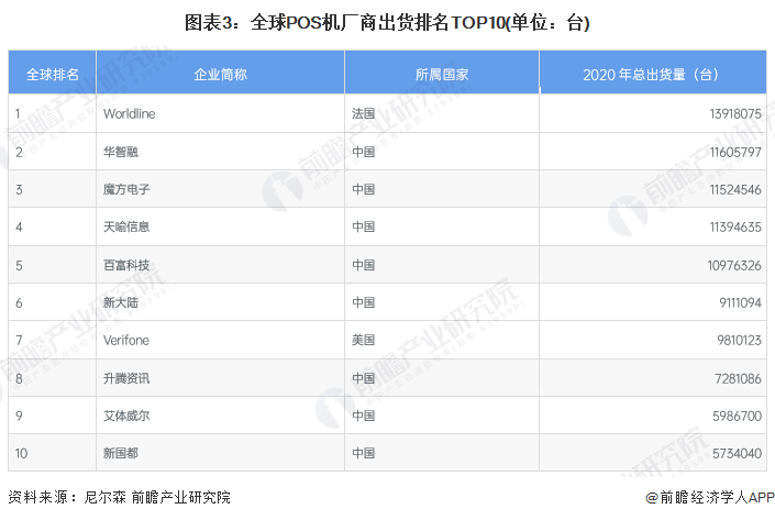 ——中国POS机企业全球出货排名及市场份额
