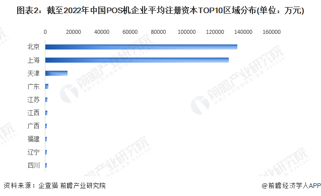 根据中国企业数据库企查猫,目前中国POS机企业的平均注册资本区域分布中,北京、上海相关企业的平均注册资本最高,均在13亿元左右,此外,天津的POS机企业平均注册规模均在1亿元以上,规模相对较大,其余平均注册资本在1000万元以上的省份还有广东、江苏、江西、广西、福建、辽宁和四川。