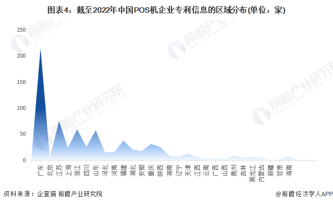 根据中国企业数据库企查猫,目前中国POS机有相关专利信息的企业主要分布在广东和江苏等地。截至目前,广东省共有215家企业拥有专利相关信息,而江苏则有76家企业拥有专利相关信息。