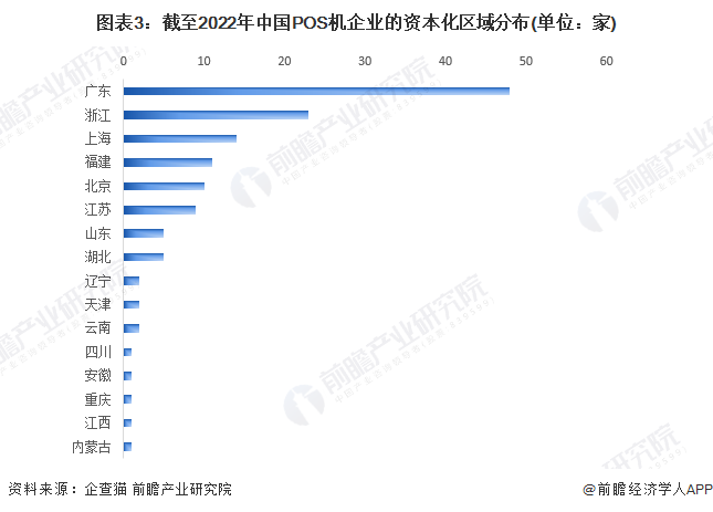 根据中国企业数据库企查猫,目前中国POS机资本化的企业(有融资信息和上市信息)的主要分布在广东、浙江和上海及福建等地。截至目前,广东共有存续和在业的资本化企业共计48家,浙江为23家,上海和福建分别为14家和11家。