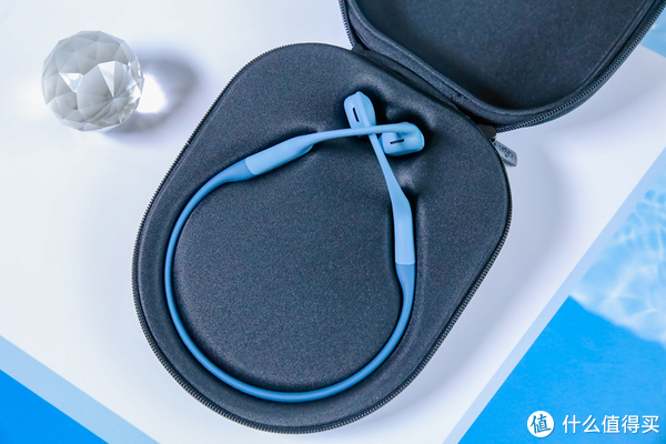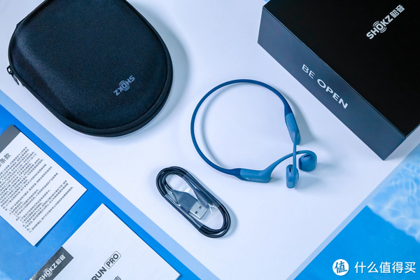 韶音全新旗舰OpenRun Pro的配色十分丰富,包括骑士黑、牛仔蓝、沙漠黄、西柚粉以及基普乔格联名款,而笔者此次入手的便是其中很显清爽感的牛仔蓝配色。开箱之后可以看到,OpenRun Pro的产品配件中除了常规的说明书、保修卡以及充电线外,还配备了一个专属实用的扁平鸭舌状硬壳包,除了极具便携性外,其内衬的定制凹槽可以稳固耳机,起到很好的保护作用。