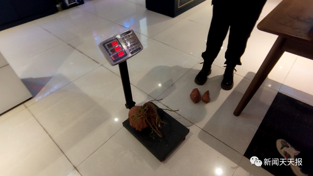 这三个红薯到底有多重呢?放上秤一称,最大的重6斤6两,稍微小一点的重6斤4两,最小的也有近5斤重,这几乎是普通红薯的20多倍。