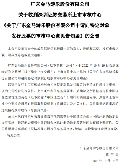 中国经济网北京10月20日讯(300756.SZ)昨晚公告称,公司于昨日收到深交所上市审核中心出具的《关于广东金马游乐股份有限公司申请向特定对象发行股票的审核中心意见告知函》。