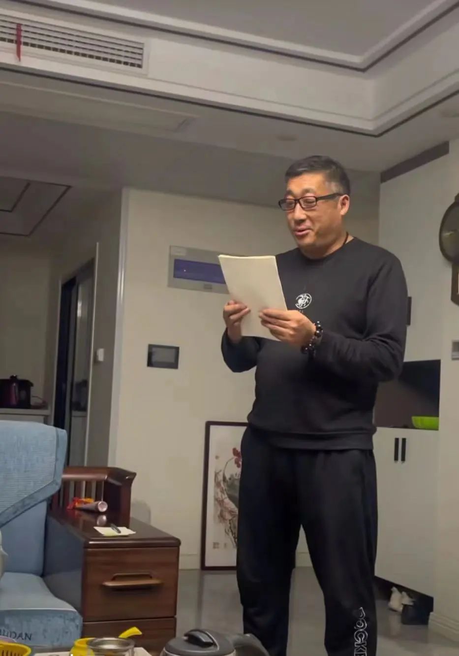 视频中,身穿灰黑色衣服的男子手持一书稿,戴着眼镜对着书稿认真道来:尊贵的各位来宾中午好……今天我这个父亲祝你们永结同心……男子还没读完,就遭到家人的大声嘲笑,哈哈哈哈哈哈哈的大笑声不断。