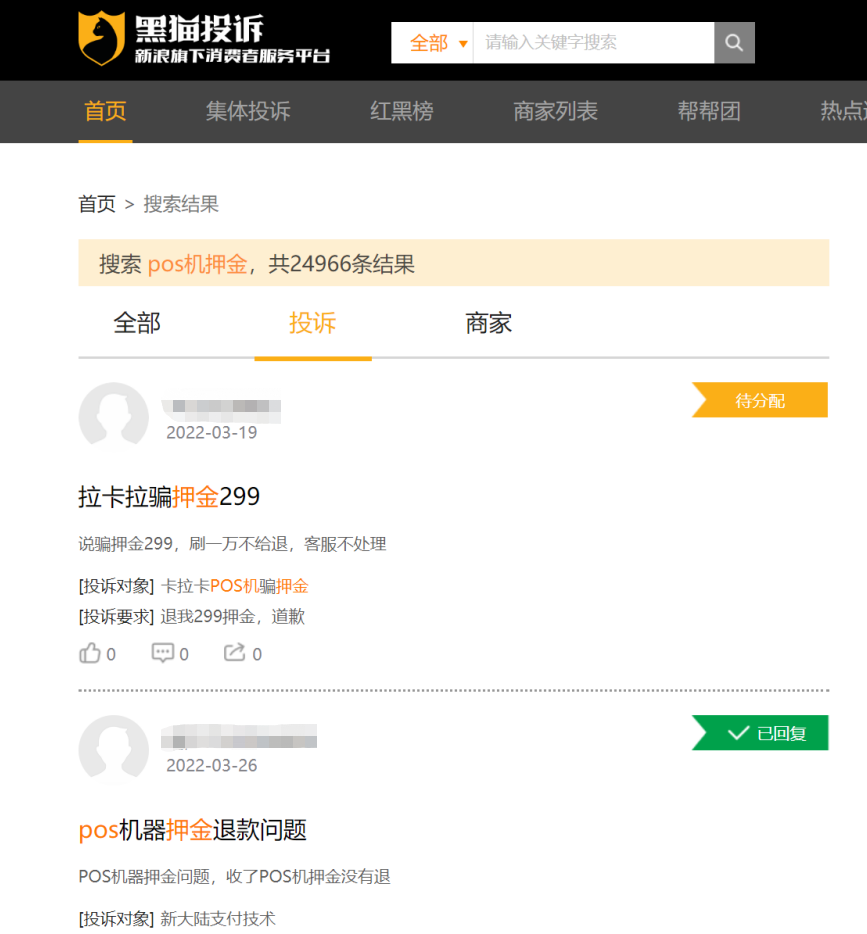 ▲在消费者服务平台黑猫投诉上,针对POS押金问题的投诉量高达24966条据了解,这些业务人员在销售POS机时的套路都如出一辙,即:业务员先是以免费赠送POS机或POS机利率低、无任何手续费等为噱头诱导消费者,待消费者装机后,又以需要支付一定金额的押金等理由反复更改押金收退规则。