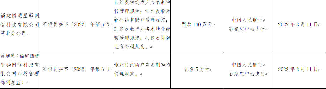 在此次处罚中,有两家支付机构被罚超百万元。其中星驿付被罚140万元。该罚单也是此次罚单中金额最大的一张。相关负责人星驿付市场管理部副总监黄旭英被罚款5万元。而此前,星驿付在2018年因执业业务规范存在不合规行为收到千万级巨额罚单。