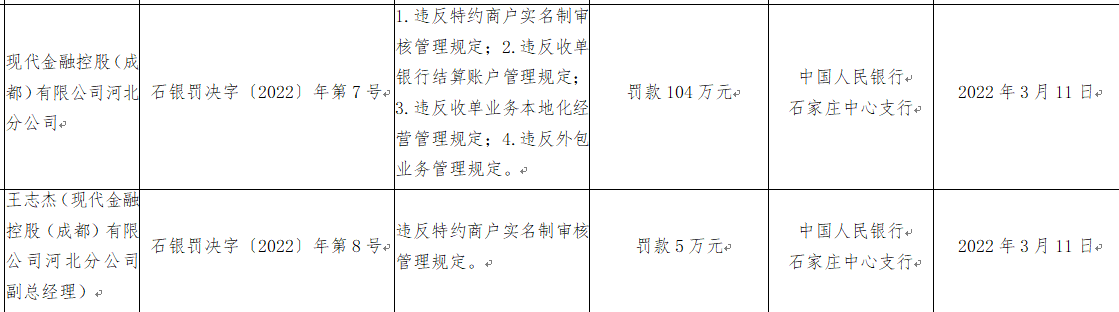 除上述的支付机构外,中付支付与开店宝支付均被罚款83万元;联动优势与汇付支付均被罚款77万元。而畅捷支付作为此次被罚金额最少的支付机构,也被罚款65万元。五家支付机构的相关负责人中付支付副总经理王伟音、开店宝支付河北分公司风控经理张雷、联动优势河北分公司总经理孙浩、汇付支付收单事业部总监谭晓晶、畅捷支付总经理高龙飞均被罚款5万元。